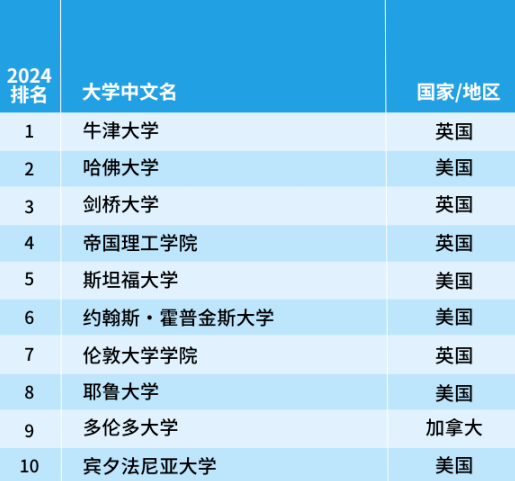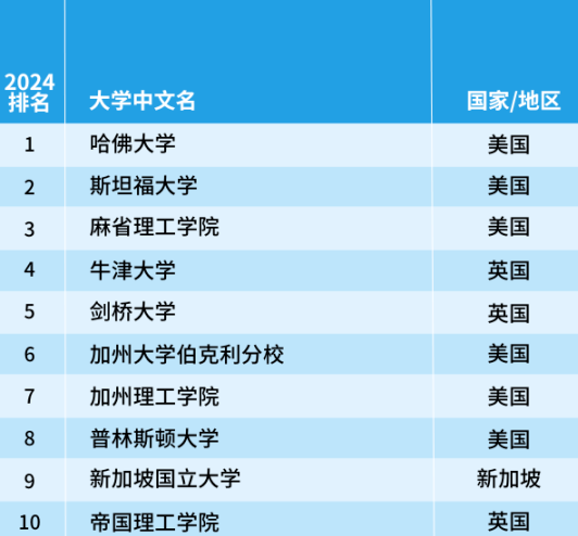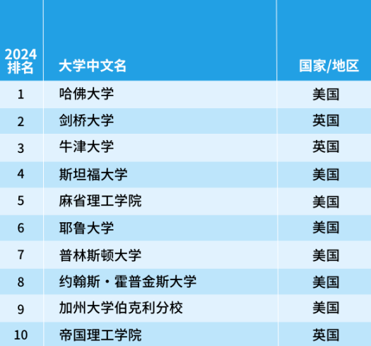 哈佛大學連續第四年排名第一。英國高校中,牛津大學和劍橋大學和分別上升了1名和2名,位于第5名和第7名。帝國理工大學此次進入前十,位于第10名的位置。