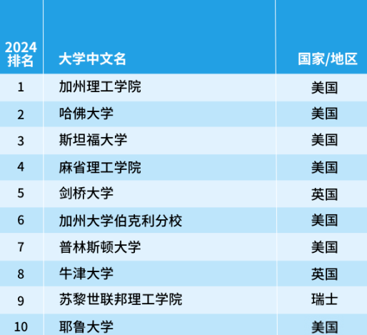 美國的加州理工學院上升3名位于榜首,英國的劍橋大學上升兩名位于第五位,瑞士蘇黎世聯邦理工學院連續第八年保持前十名的位置,再次排名第9。
